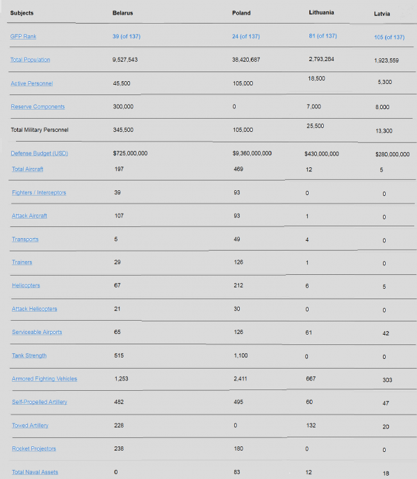 Вместе с тем, все эти сопоставления достаточно условны, так как на стороне Польши, Литвы и Латвии – весь военный потенциал Североатлантического альянса. Тем не менее, данные Military Strength Ranking-2019 вполне подкрепляют тезис о том, что белорусская армия представляет собой довольно значительную военную силу в масштабах Восточноевропейского региона.