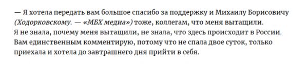 Примечательно, что и сама она не поблагодарила министерство. Зато разродилась целой речью в адрес МБХ и Ходорковского, к которому явно неровно дышит. Да и с его медиа она давно и плотно сотрудничает.