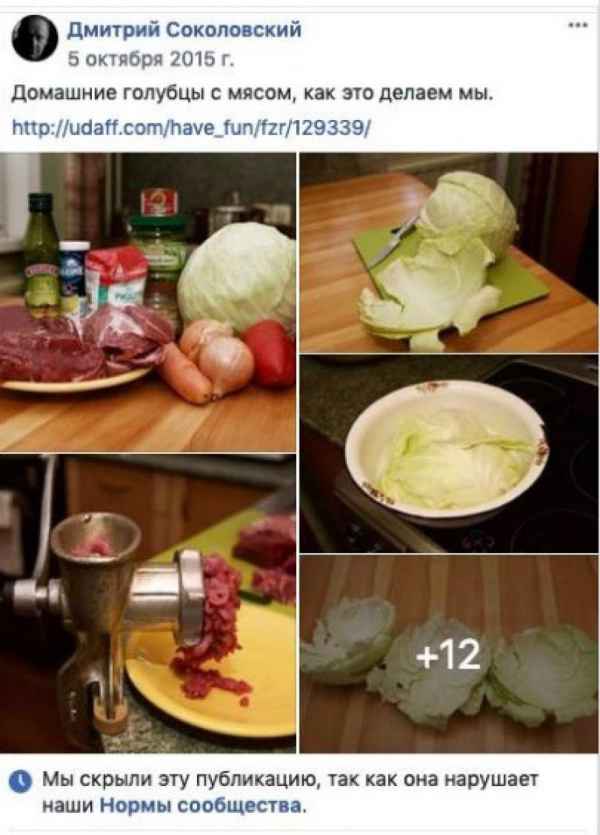 Ну а остальных неугодных Facebook продолжает банить. Не совсем понятно, что именно американцам не угодили русские рецепты. Но, видимо, они посчитали голубцы одним из самых главных врагов.