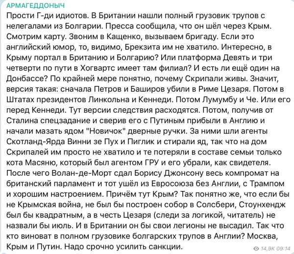 «Прости Г-ди идиотов. В Британии нашли полный грузовик трупов с нелегалами из Болгарии. Пресса сообщила, что он шел через Крым. Смотрим карту. Звоним в Кащенко, вызываем бригаду», – написал Сатановский в своем Telegram-канале.