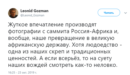 Конечно, либеральная тусовка не могла пройти мимо этого поистине уникального события для мировой истории и на сей раз тоже вставила свои «пять копеек». Одним из первых высказался о саммите экс-руководитель «Союза правых сил» Леонид Гозман. Правда, как всегда не удержался и опустился до откровенного расизма, называв делегатов из Африки в своем Twitter – людоедами.