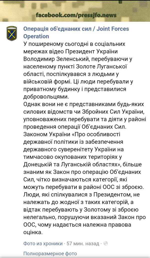 В это же время штабе ООС заявили, что добровольцы с оружием находятся в Золотом нелегально... т.е. незаконное военное формирование, которое не имеет право пользоваться оружием, находится на линии разграничения и не выполняет приказ главнокомандующего. Т.н. штаб ООС, проводящий карательную операцию на Донбассе - только что признал что на линии фронта находятся незаконные вооруженные неконтролируемые никем, формирования.