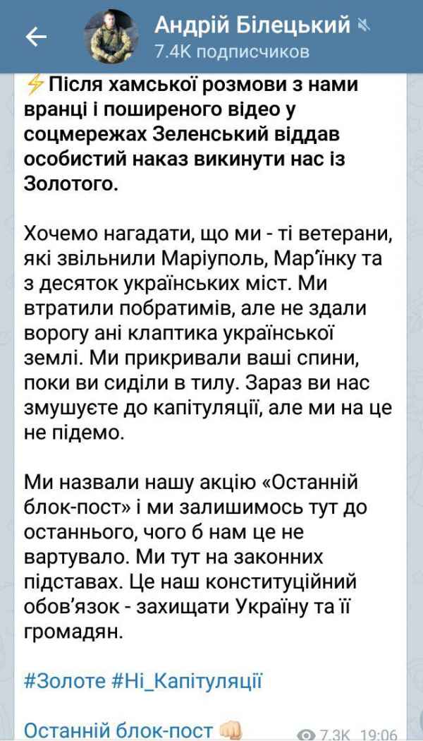 После посещения незаконных военных, проснулся пан Билецкий и начал отчаянно хрюкать... пригрозил президенту Украины Зеленскому перекинуть в поселок Золотое, где должен был состояться отвод войск, десятки тысяч бойцов.