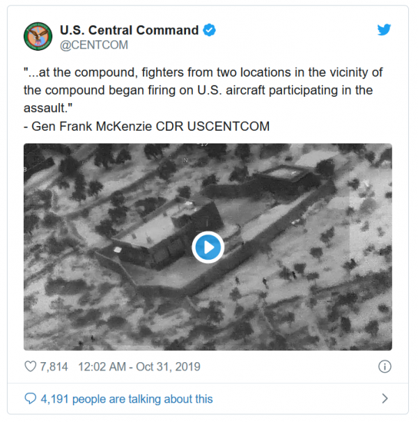 Центральное командование вооруженных сил США опубликовало видео начала штурма дома в сирийской провинции Идлиб, где, по их словам, укрывался ликвидированный террорист Абу Бакар аль-Багдади.