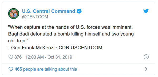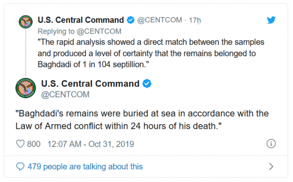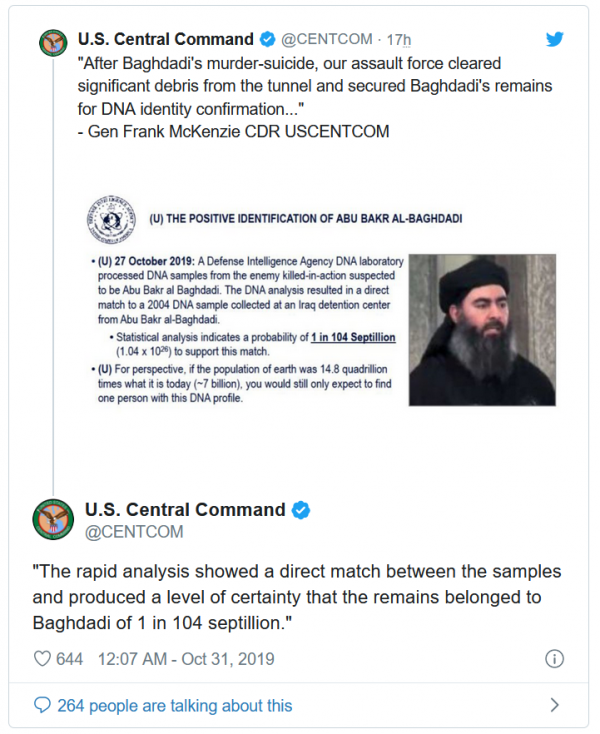 Глава Центрального командования ВС заявил о том, что личность аль-Багдади была установлена с абсолютной точностью с помощью анализа ДНК