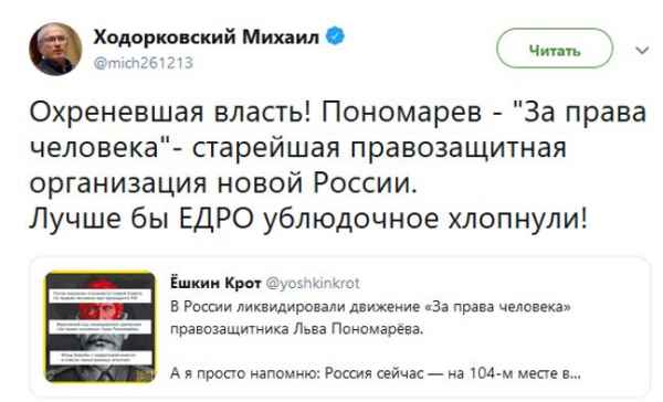 После решения о закрытии его организации, Пономарев заявил о том, что продолжит свою деятельность: под новым названием и от имени нового юрлица. И нет сомнения, что Запад окажет ему в этом всемерную помощь. Западным русофобам очень нужны такие люди для продвижения своих интересов в России.