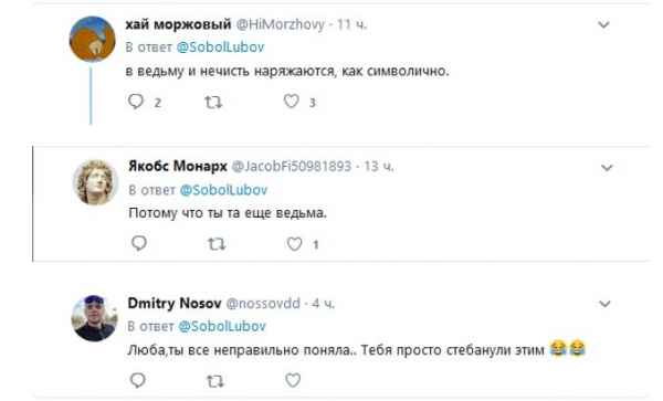 Да, действительно, мужчина подражал именно юристу ФБК. Любой здравомыслящий человек понял бы, что это сделано в насмешку – ведь в этот день люди наряжаются в костюмы всякой нечисти. Но Соболь восприняла это как свидетельство своей популярности.