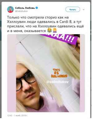 Так, в своем микроблоге в «Твиттере» она с гордостью написала, что на Хеллоуин люди одевались в нее, и приложила фото мужчины в парике «под Соболь» и в очках.