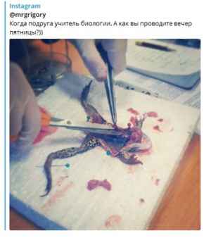 Хотя и до него тема мертвечины занимала важное место в жизни соратницы Навального. Можно сказать, это у нее на генном уровне. Вовсе неслучайно, например, что у Григория Мусатова, сына отца Любы от второго брака, любимое развлечение – препарировать лягушек.