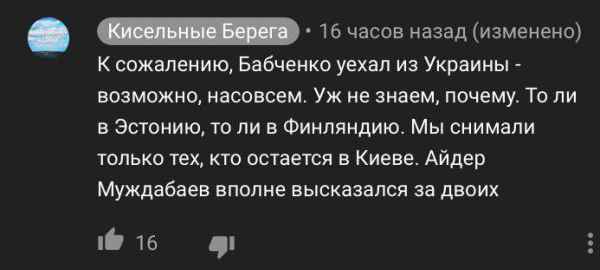 «К сожалению, Бабченко уехал из Украины — возможно, насовсем. Уж не знаем, почему. То ли в Эстонию, то ли в Финляндию. Мы снимали только тех, кто остается в Киеве. Айдер Муждабаев вполне высказался за двоих».