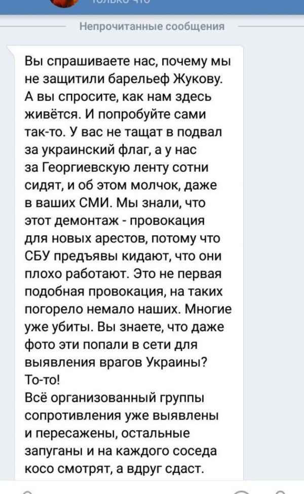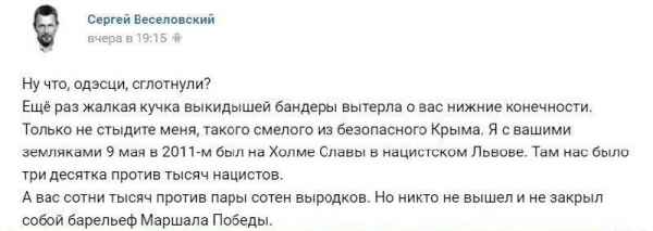 «Ну что, одэсци, сглотнули? Ещё раз жалкая кучка выкидышей бандеры вытерла о вас нижние конечности. Только не стыдите меня, такого смелого из безопасного Крыма. Я с вашими земляками 9-го мая в 2011-м был на Холме Славы в нацистском Львове. Там нас было три десятка против тысяч фашистов.
