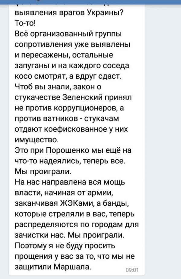 Я не знаю чего еще можно сделать в городе, контролируемом бандеровцами. Умереть? Чтобы кому-то было что-то сказать на ютюбе, да в шоу Соловьева еще раз просопеть: «не забудем, не простим»? Уже забыли и простили! Как-то не помнят некоторые «профессиональные русские» бойню в Одессе. Забыли и про то, что 3-го мая 2014-го года в РОВД, в которое свозились выжившие куликовцы, толпа одесситов выломала кованные ворота и выбила бронированные двери, освободив ребят.