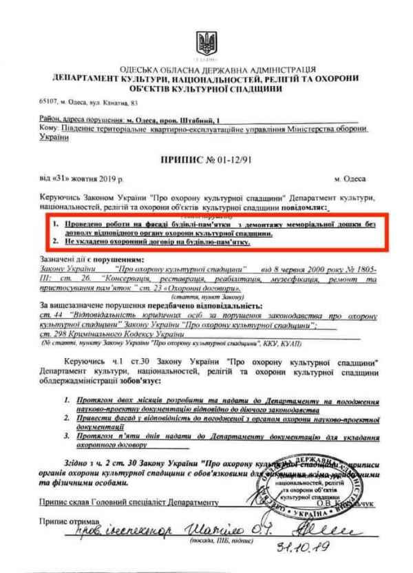 Вандалы, вырубившие барельеф, махали какой-то писулькой — разрешением на снос от квартирно-эсксплуатационного отдела, а позже был обнародован документ Областного департамента охраны объектов культурного наследия о том, что демонтаж незаконный.
