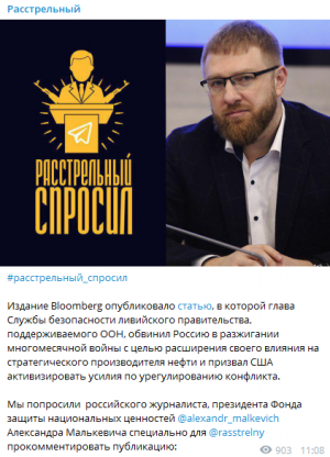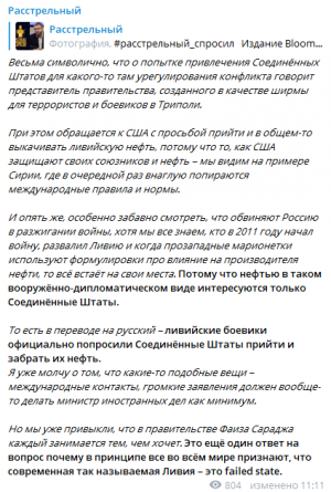 Таким образом, данное заявление по мнению Малькевича можно расценивать как призыв ливийских боевиков к США прейти и взять их нефть. Каких еще заявлений можно было ожидать от американских ставленников?