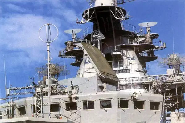 - второй радар - 3Р41 «Волна», получивший на флоте за характерный облик прозвище «сиська» (хорошо видна в кормовой части надстройки). Вообще-то, на этом месте панировали установить современный 4Р48, но, увы, при строительстве крейсера средств хватило только на «сиську», а современные 4Р48 были проданы за рубеж и установлены на борту китайских эсминцев типа «Лючжоу».