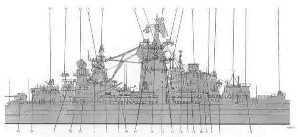 1 – боевой модуль ЗРАК «Кортик»; 2 – ПУ СГ1ПП ПК-10; 3 – командный модуль ЗРАК «Кортик»; 4 – АП радиопеленгатора; 5 – стабилизированный пост ТВ системы наблюдения за ближней наружной обстановкой «Ротан»; 6 – АП РЛС «Вайгач»; 7 – ходовая рубка; 8 – АП комплекса «Кристалл-БК»; 9 – АП астрокорректора; 10 – оптический перископический визир ходовой рубки; 11 – АП РЛС СУ «Форт-М» ЗРК С-300ФМ; 12 – ходовой мостик; 13 – оптический перископический визир боевой рубки (ГКП); 14 – оперативная рубка; 15 – АП системы «Привод-В»; 16 – АП РЛС «Восход»; 17 – АП системы «Привод-В»; 18 – АП РЛС «Восход»; 17 – АП комплекса средств РЭБ «Кантата-М»; 18 – АП комплекса «Коралл-БН»; 19 – АП РЛС «Подкат»; 20 -резиновые сферические швартовые кранцы; 21 – АП РЛС «Фрегат-М2»; 22 – АП РЛС СУ «Форт» ЗРК С-300Ф; 23 – РБУ-12000 комплекса «Удав-1»; 24 – лацпорт РТПУ ПАРК «Водопад»; 25 – АП РЛС СУАО «Лев»; 26 – АП РЛС СУ ЗРК «Кинжал»; 27 – командный пункт управления посадкой (взлетом) вертолета; 28 – 130-мм АУ АК-130.