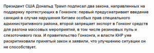 Демонстранты, уверенные в том, что в материковом Китае их ждут пытки, дача показаний под давлением и проблемы с доступом к защите, назвали подписанный Трампом закон «Удачным подарком ко Дню благодарения». Но подписанный американским президентом закон только на первый взгляд служат урегулированию конфликта: странным образом демократия и права человека перемежаются в нем с экспортным регулированием и санкциями, введенными ООН против Гонконга.
