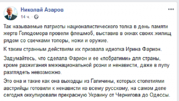 «Задумайтесь, что сделала Фарион и ее "побратими" для страны, кроме разжигания межнациональной розни и ненависти, даже в лупу разглядеть невозможно», – написал Азаров в Facebook.