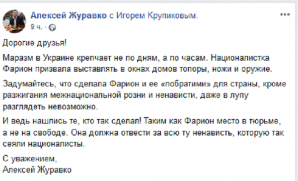 «И ведь нашлись те, кто так сделал! Таким, как Фарион, место в тюрьме, а не на свободе. Она должна ответить за всю ту ненависть, которую сеяли националисты».