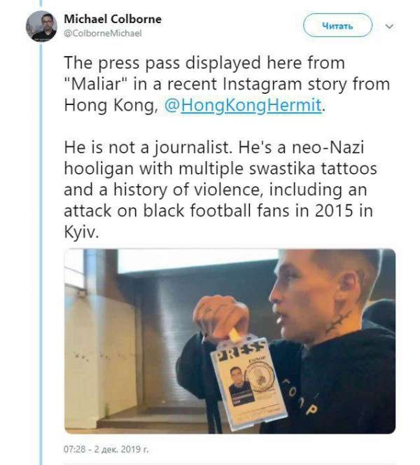Маляра также опознал канадский журналист Майкл Колборн, освещающий события в Восточной и Центральной Европе, сообщивший в Твиттере, что «нацистский хулиган» Маляр в Гонконге выдаёт себя за журналиста, предъявляя липовое удостоверение.