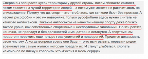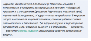 Предвзятость и заказной характер этого решения бросается в глаза. Но вместо того, чтобы возмутиться решением Всемирного антидопингового агентства, сотрудники «Эха Москвы» принялись осуждать спортсменов и призывать их выступить под флагами других стран.