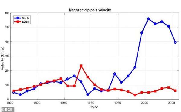 Северный магнитный полюс, условная точка в Северном полушарии Земли, со скоростью, которой ранее не бывало, движется в сторону Сибири. Учёные называют число в почти 50 километров в год, и с момента своего открытия в 1831 году он "пробежал" около 2250 километров. Рекордной скорости Северный магнитный полюс достиг только в 90-е годы прошлого века, а до этого никуда не торопился, преодолевая по 15 километров в год.