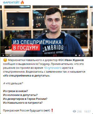 Так, после отбытия очередных 10-ти суток ареста протеже Навального Иван Жданов заявил, что выдвинет свою кандидатуру на выборах. По словам директора т.н. Фонда борьбы с коррупцией (ФБК, признан иноагентом), он не упустит этой возможности.