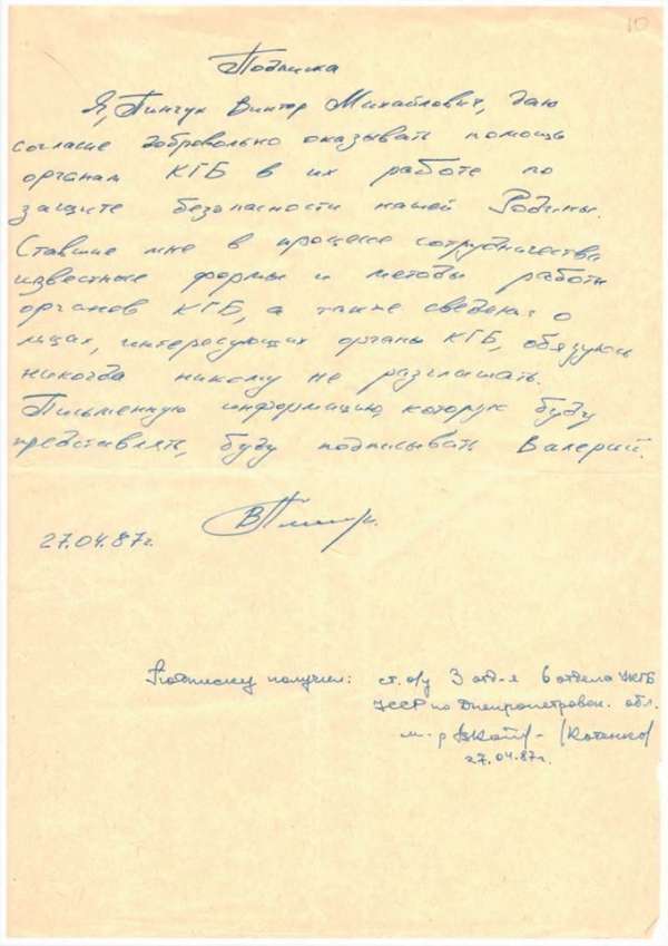 — Вы показали агентурную подписку якобы Виктора Пинчука, в которой он даёт определённые обязательства КГБ в 1987 году. У вас есть уверенность в подлинности данного документа? Где территориально находятся бывшие коллеги (как вы их назвали), передавшие вам этот документ? Уточню: на территории какой страны?