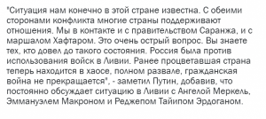 Сотрудник информагентства Anadolu поинтересовался: действительно ли власти РФ поддерживают законное правительство Сирии и Ливии или же, как утверждают западные журналисты, поддерживает командующего Ливийской национальной армии Халифа Хафтара?