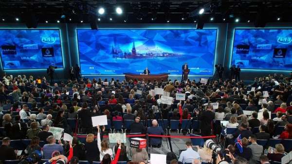 Что касается самой конференции, то в этом году она стала рекордной по числу журналистов – 1895 представителей российских и зарубежных СМИ, а сама беседа длилась более четырех часов: но и этого времени хватило ответить лишь на полсотни вопросов. Первое, что бросалось в глаза, это жесткая конкуренция за право вступить в диалог с лидером, а многих интервьюеров это желание сподвигло привлечь к себе внимание весьма оригинальными выходками и даже нарядами.