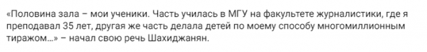 Ярким персонажем на встрече стал преподаватель и журналист МГУ Владимир Шахиджанян, который рассмешил президента прямо во время прямой линии. Как только лидер предложил ему задать вопрос, тот встал, и с уверенностью заявил, что половина присутствующих – его ученики, другие же были рождены по его авторскому способу.