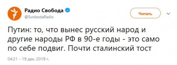 Так, на «Радио Свобода» попытались высмеять слова президента о русском народе и тяготах, которые он перенес во время Великой Отечественной войны.