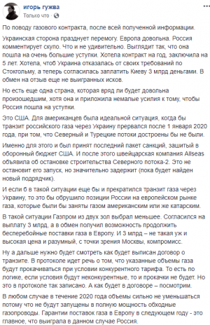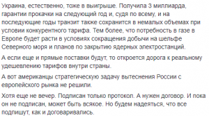 "Украинская сторона празднует перемогу. Европа довольна. Россия комментирует скупо. Что и не удивительно. Выглядит так, что она пошла на очень большие уступки. Хотела контракт на год, заключила на 5 лет. Хотела, чтоб Украина отказалась от своих требований по Стокгольму, а теперь согласилась заплатить Киеву 3 млрд деньгами. В обмен на отзыв еще не выигранных исков.