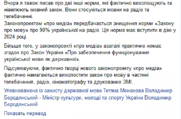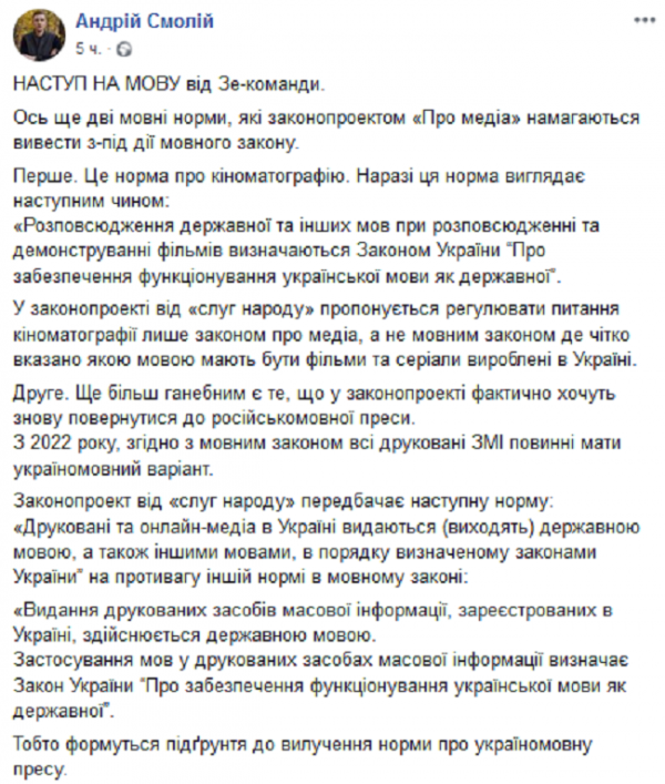 «Законопроектом "О медиа" предполагается уничтожение нормы "Закона о языке" - 90% украинского на радио. Исчезает норма об украинском языке на телевидении по отношению к языку гостей, экспертов, участников программ. Эти нормы должны вступить в действие в 2024 году. В законопроекте "О медиа" вообще практически нет упоминаний о Законе Украины "Об обеспечении функционирования украинского языка как государственного», — сетует Смолий.
