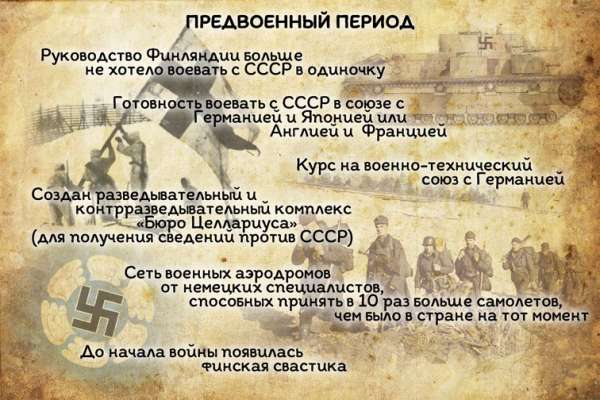 31 июля 1940 года на совещании высшего командования вермахта, принявшем решение о подготовке нападения на СССР, Финляндия была отнесена к числу вероятных союзников Германии. Известно, что в директиве № 21 под условным названием План "Барбаросса" от 18 декабря 1940 года немцы отвели место и финнам в осуществлении данного плана. В конце мая - начале июня 1941 года во время переговоров между представителями высшего военного командования Германии и Финляндии были подробно обсуждены задачи финнов в завершении подготовки и ведении войны против СССР. Уже 17 июня 1941 года в Финляндии была объявлена всеобщая мобилизация, что вызвало, кстати, крайнее недоумение советского посольства в Хельсинки. А 21 июня, несмотря на свой официальный нейтральный статус, Финляндия предоставила немцам свои аэродромы на юге.