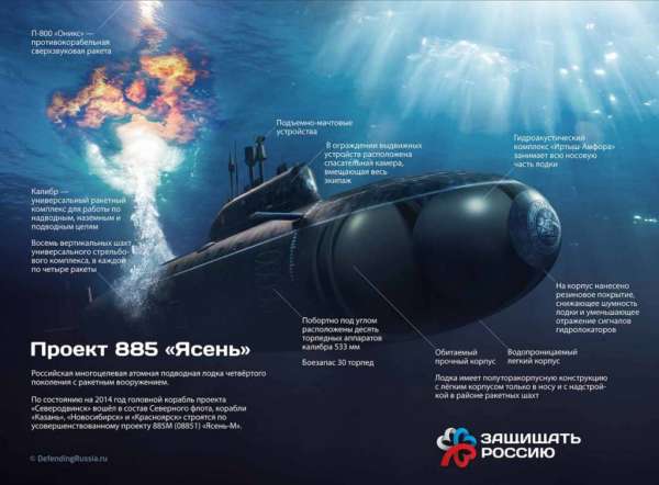 В России спустили на воду первую серийную подводную лодку проекта 08851 «Ясень-М» — дальнейшее развитие субмарины «Ясень». Специалисты относят ее к четвертому поколению и считают потенциально одной из наиболее мощных многоцелевых подлодок.