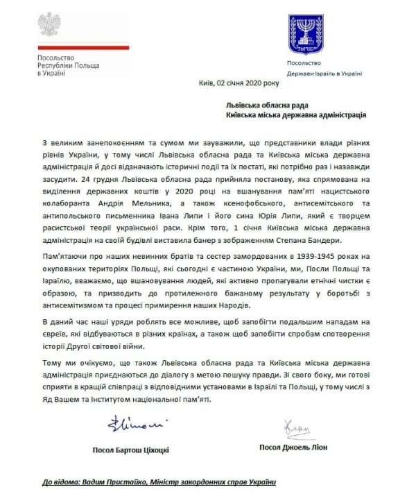Помня о наших невинных братьях и сестрах, убитых в 1939-1945 годах на оккупированных территориях Польши, которые сегодня являются частью Украины, мы, Послы Польши и Израиля, считаем, что чествование людей, которые активно пропагандировали этнические чистки является оскорблением, и приводит к противоположному желаемому результату в борьбе с антисемитизмом и процессе примирения наших народов.