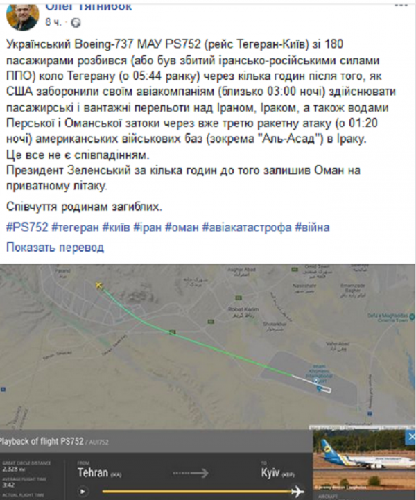 Лидер украинской националистической партии «Свобода» Олег Тягнибок считает, что Россия может быть причастна к крушению Boeing «Международных авиалиний Украины» (МАУ) в Иране.