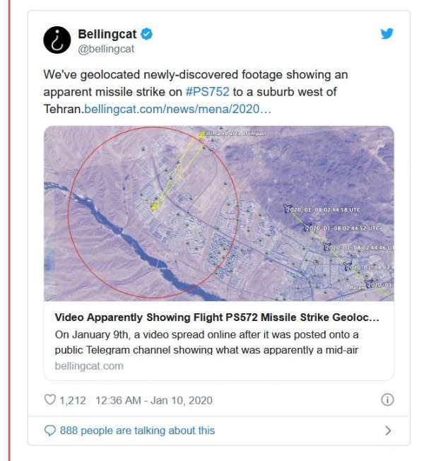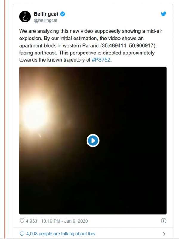 Международная группа Bellingcat, которая занимается в том числе и расследованием авиакатастроф заявила о том, что им удалось определить геолокацию места съемки и она совпала с траекторией полета рейса PS752.