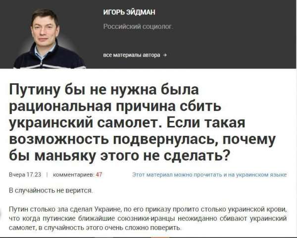Своё мнение высказал и сбежавший с позором на Украину публицист-либерал Игорь Эйдман. «Эксперт по социологии» также выдвинул обвинения в сторону РФ, не имея на то ни оснований, ни полномочий.