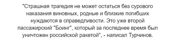Однако воздержаться от комментариев не смог бывший секретарь Совета национальной безопасности и обороны Украины Александр Турчинов, призвавший наказать за сбитый Boeing не только Иран, но и Россию, которая, как он утверждает, могла участвовать в подготовке катастрофы. Смелое заявление человека, чья русофобия, кажется, достигла своего апогея.