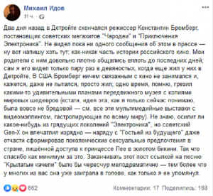 «Два дня назад в Детройте скончался режиссер Константин Бромберг, постановщик советских мегахитов "Чародеи" и "Приключения Электроника"», — написал Идов.