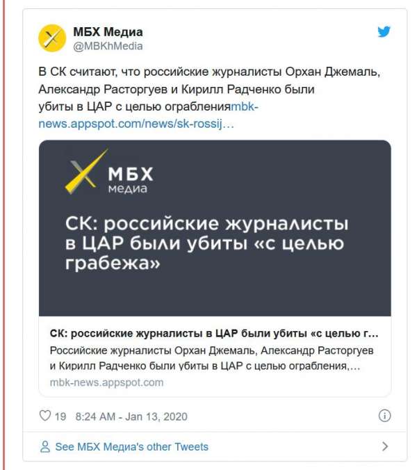 «По данным источников «Досье», правоохранительные органы в ЦАР не предпринимают действий по расследованию преступления, а следствие в России по факту убийства ведется медленно и неэффективно».