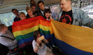Собственно, вот эти «херои», похохотавшие в автозаке под украинские песни, а на выходке скандировавшие украинские националистические кричалки. Выручать тут же примчался лоббист гей-пропаганды среди подростков Борис Вишневский, встречавший участников незаконной акции и забиравший их под «яблочное крыло».