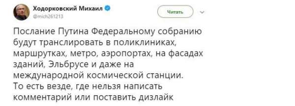 Ходорковский уже не знает, куда присунуть свое мнение. Он тиражирует его в заказных материалах либеральных СМИ, строит рожу на Ютубе, строчит посты в Твиттере. По поводу Послания он написал тупую шутку о трансляции мероприятия там, где якобы нельзя поставить дизалайк и написать комментарий.