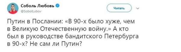 «Отличилась» и Соболь. Она высмеяла слова президента о 90-х. К слову, в те времена он был заместителем мэра в СПб, а вот заправляли всем как раз беглые олигархи Ходорковский да Березовский.