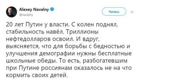 Навальный тоже решил высказаться. Правда, в Твиттере. Видно, еще не приехал из Таиланда. Судя по всему, блогер там нехило расслабился с трансвеститами, потому что раскритиковал инициативу бесплатного питания для всех учащихся младшей школы.
