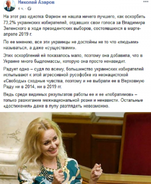 «На этот раз идиотка Фарион не нашла ничего лучшего, как оскорбить 73,2% украинских избирателей, отдавших свои голоса за Владимира Зеленского в ходе президентских выборов, состоявшихся в марте-апреле 2019 г.