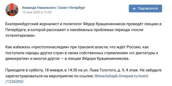 Так, петербургский штаб Навального приглашает всех желающих на лекцию недополитолога Федора Крашенникова. Этот товарищ взаимодействует с ближайшим дружком Навального Леонидом Волковым. Вместе они в 2011 году написали книгу «Облачная демократия» и топят за автономию Урала.