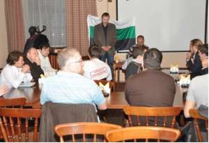 Все эти годы Крашенников не без содействия Волкова продвигал проект «Уральской республики». На этом фото он проводит дискуссию на эту тему. На мероприятии присутствуют Волков, Киселев и другие. Там виден флаг, символизирующий так называемую «Уральскую республику».